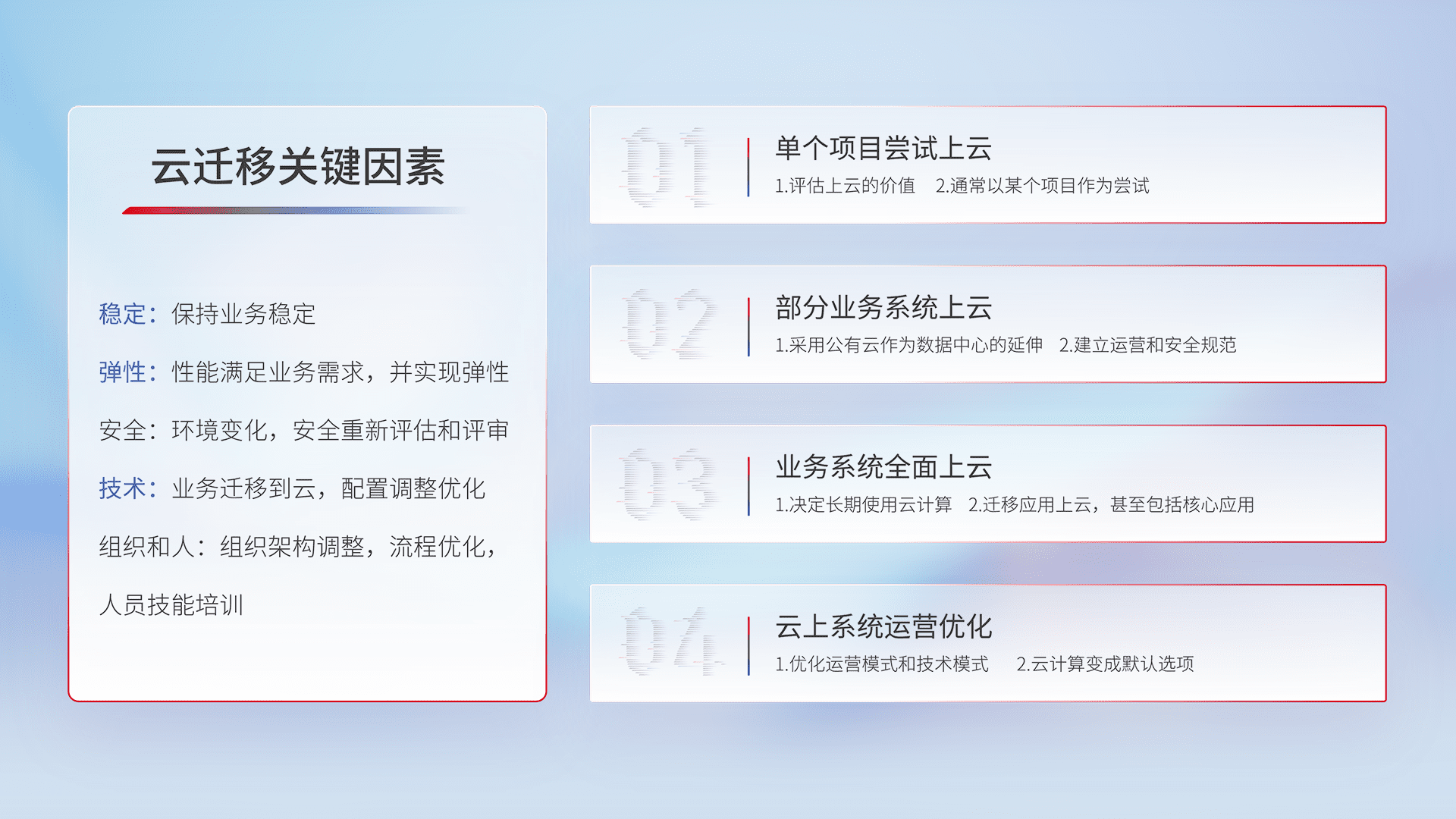 结合实际业务,,,,从规划设计、、云平台选型、、云原生改造、、、、数据迁移、、、、集成交付,,,迁移全过程为客户识别最佳上云路径,,,做好风险识别管理,,,设计网络架构、、、身份权限、、、、安全审计合规、、、操作审计、、、、日志审计、、监控告警策略、、、、多站点容灾设计等,,对云上基础设施进行整体规划,,,提升IT治理水平,,,以满足弹性、、高可用、、、、高性能的需求。。。